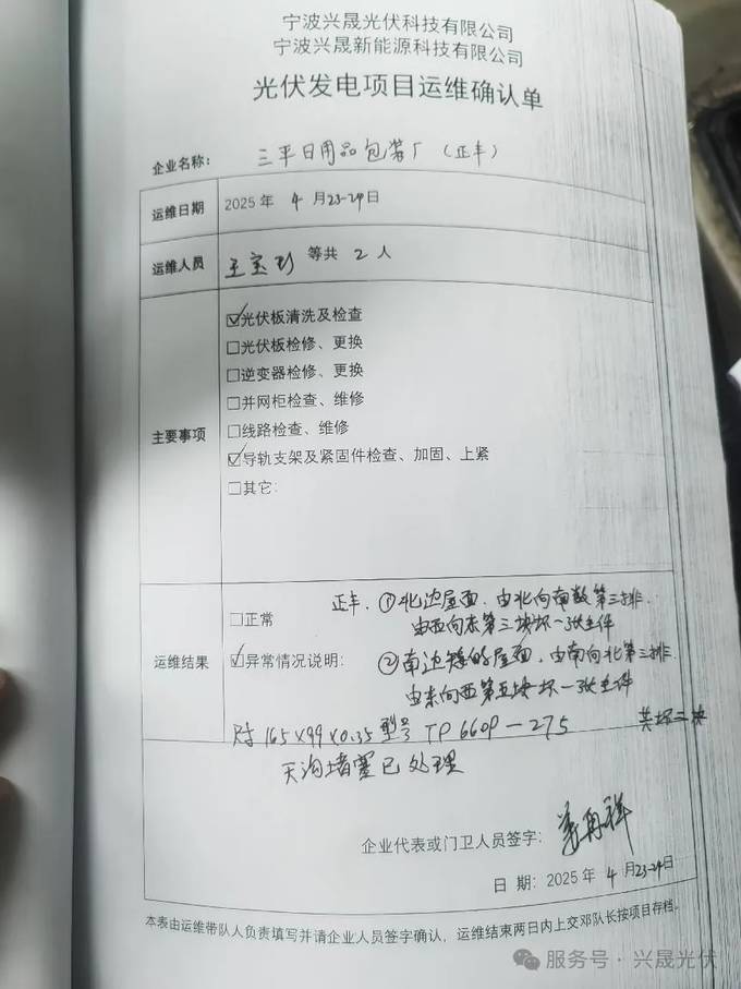 “運維無小事”是興晟團隊的核心準則。每一次現(xiàn)場作業(yè)均嚴格執(zhí)行“登記-操作-驗收”流程,并通過企業(yè)簽字確認,確保責(zé)任可追溯。在余姚某商業(yè)屋頂項目中,運維人員發(fā)現(xiàn)組件因不明物體產(chǎn)生斑點,立即啟動應(yīng)急預(yù)案,48小時內(nèi)完成更換,全程透明化溝通,贏得客戶高度認可。